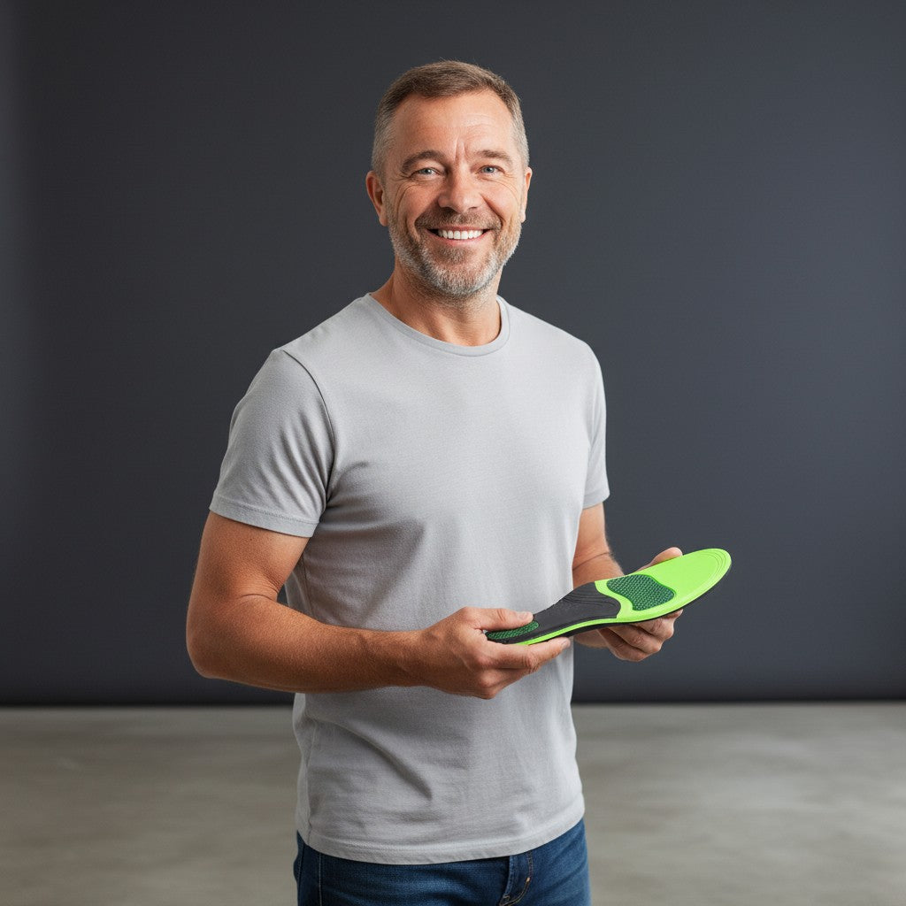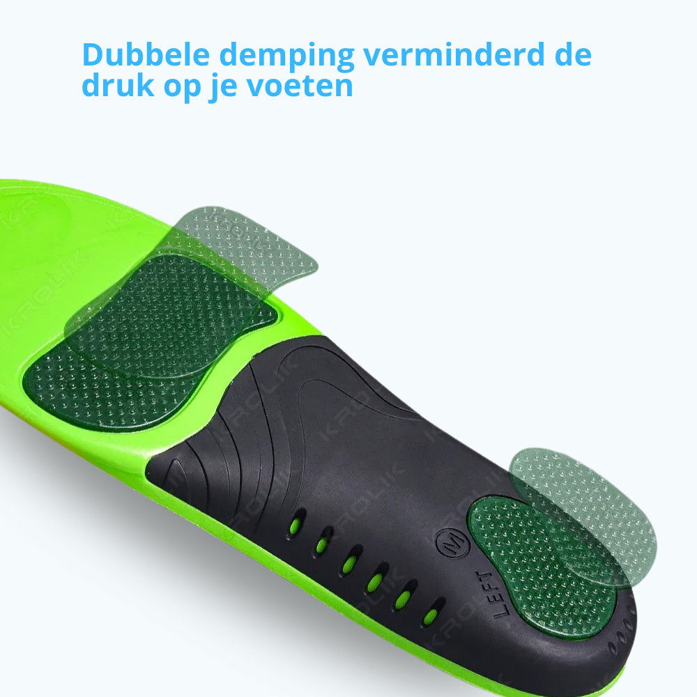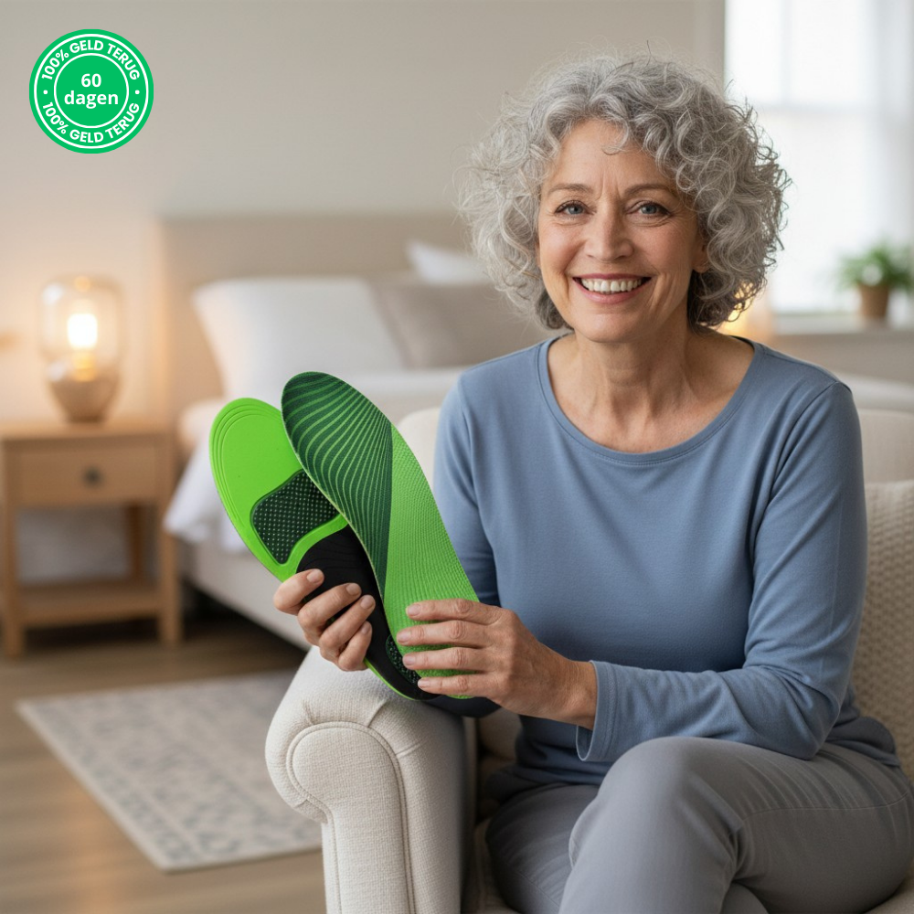 Deze slimme inlegzooltjes corrigeren subtiel de stand van je voeten, precies daar waar het misgaat. Daardoor verbetert je houding, wordt de druk beter verdeeld en verdwijnt de belasting op je knieën, heupen en onderrug. Geen fysio. Geen arts. Geen ingreep. Je legt je gewoon in je eigen schoenen en loopt bijna direct weer zoals voorheen.